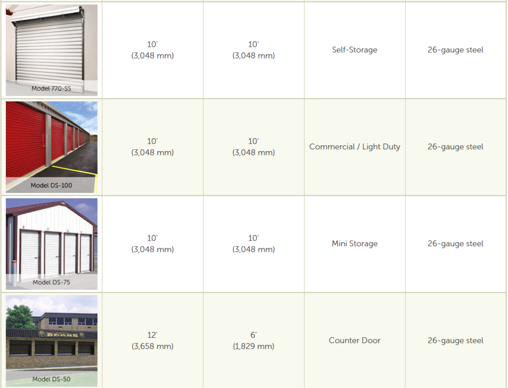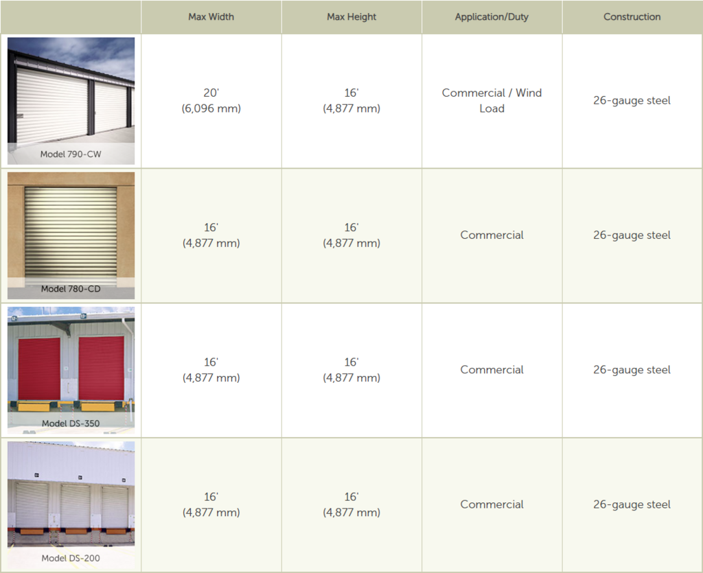 The following chart can help you determine which of the Wayne Dalton Rolling Sheet Doors / Storage Doors is best for your specific application. For more information, contact Customer Service at (800) 764-1457.